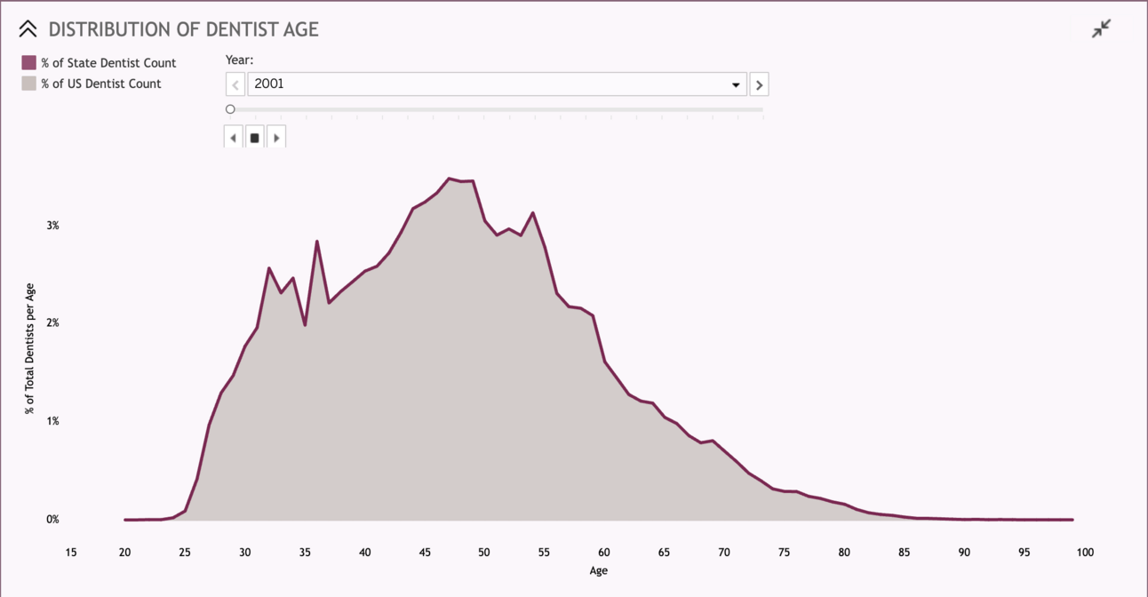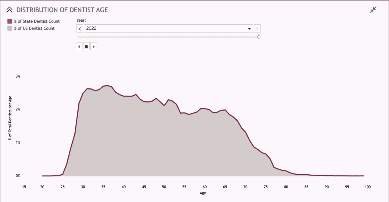 Now, compare that to the distribution of practicing dentists’ ages in 2022.